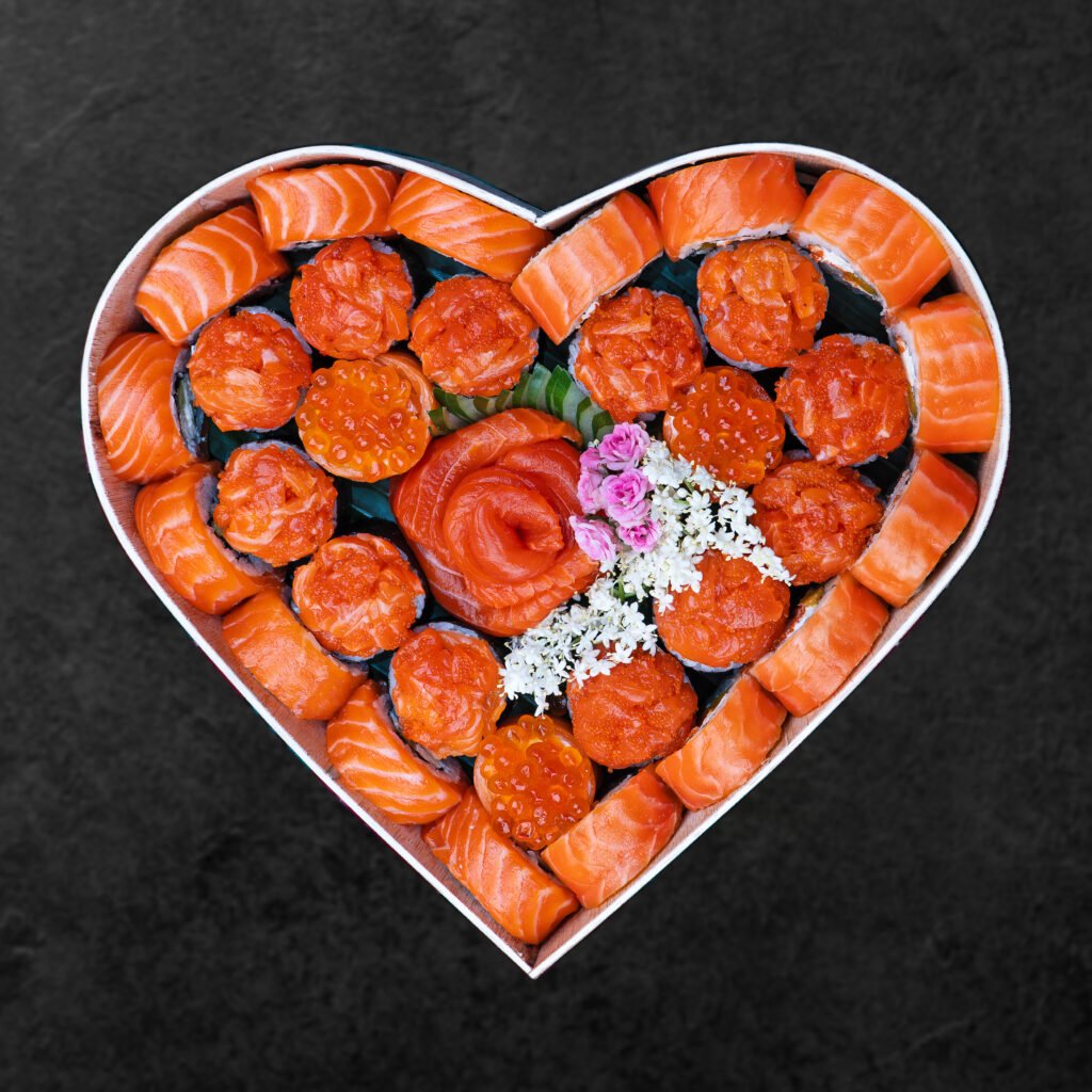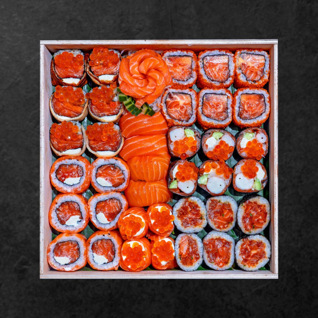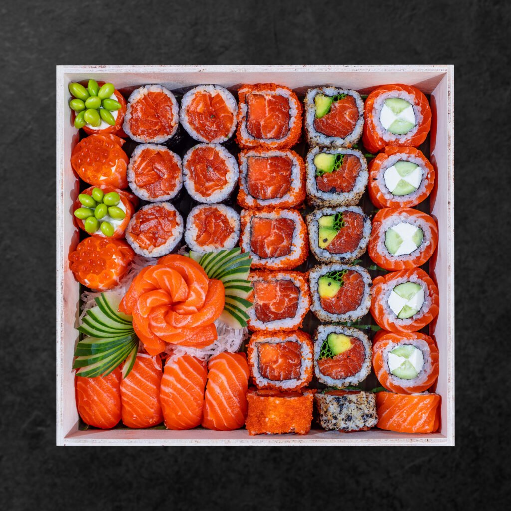 Philadelphia Roll 6pcs, Furikake Roll 6pcs, Tobiko Roll 6pcs, Salmon Maki 6pcs, Salmon Nigiri 4pcs, Salmon Sashimi 4pcs, Hana Sushi Caviar 2pcs, Hana Sushi Edamame 2pcs, (already include condiment truffle edamame, soy sauce, pickle ginger, wasabi)