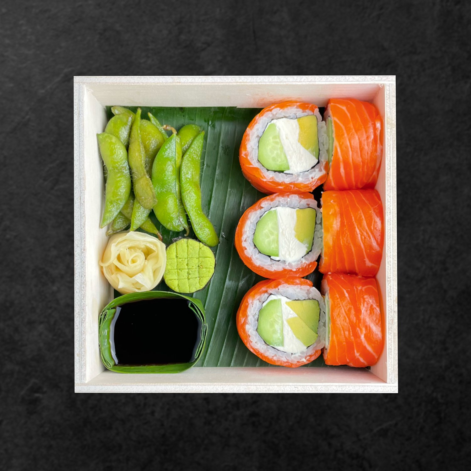 (6 pcs) rice, nori, extremely fresh salmon, creamcheese, avokado, cucumber, (already include condiment truffle edamame, soy sauce, pickle ginger, wasabi)