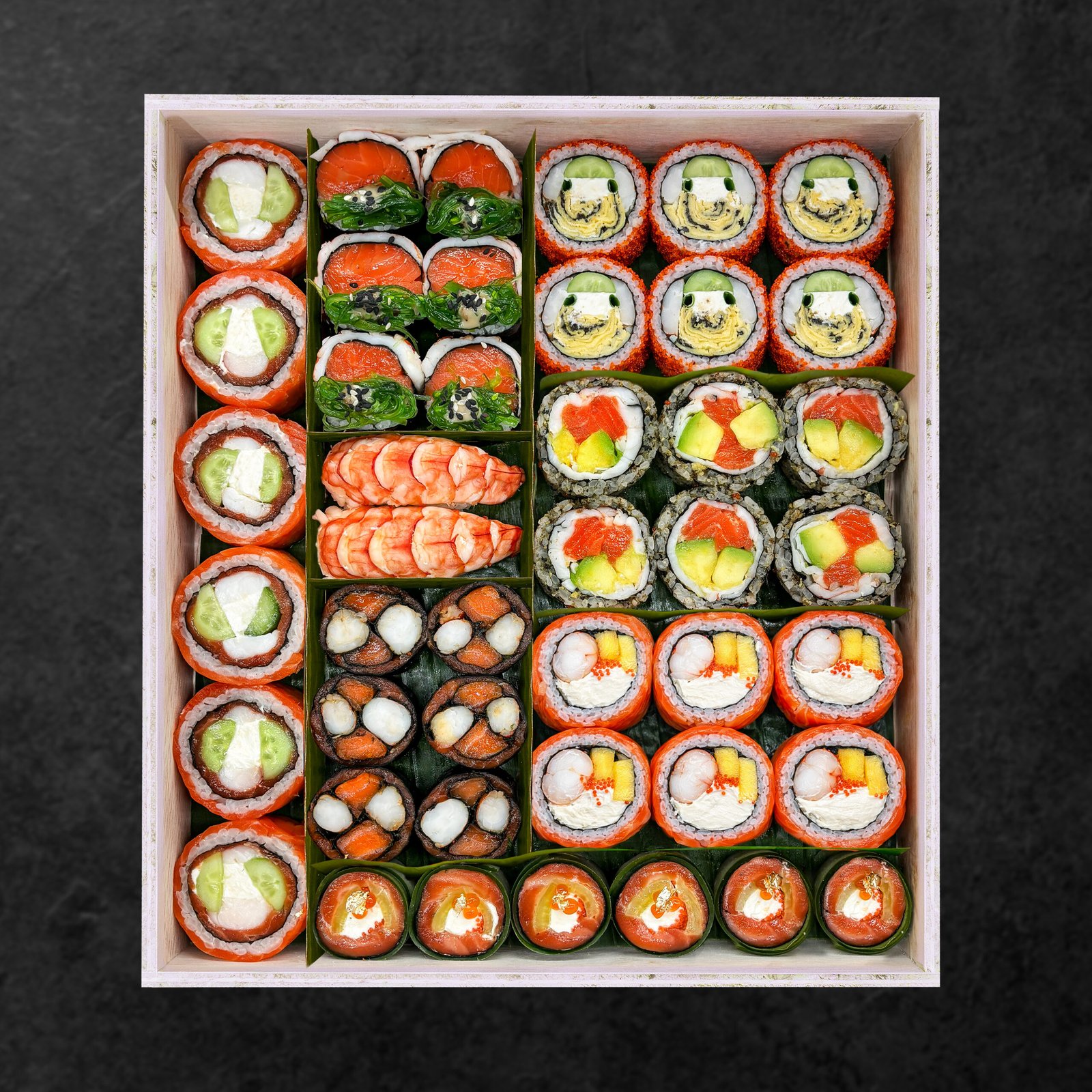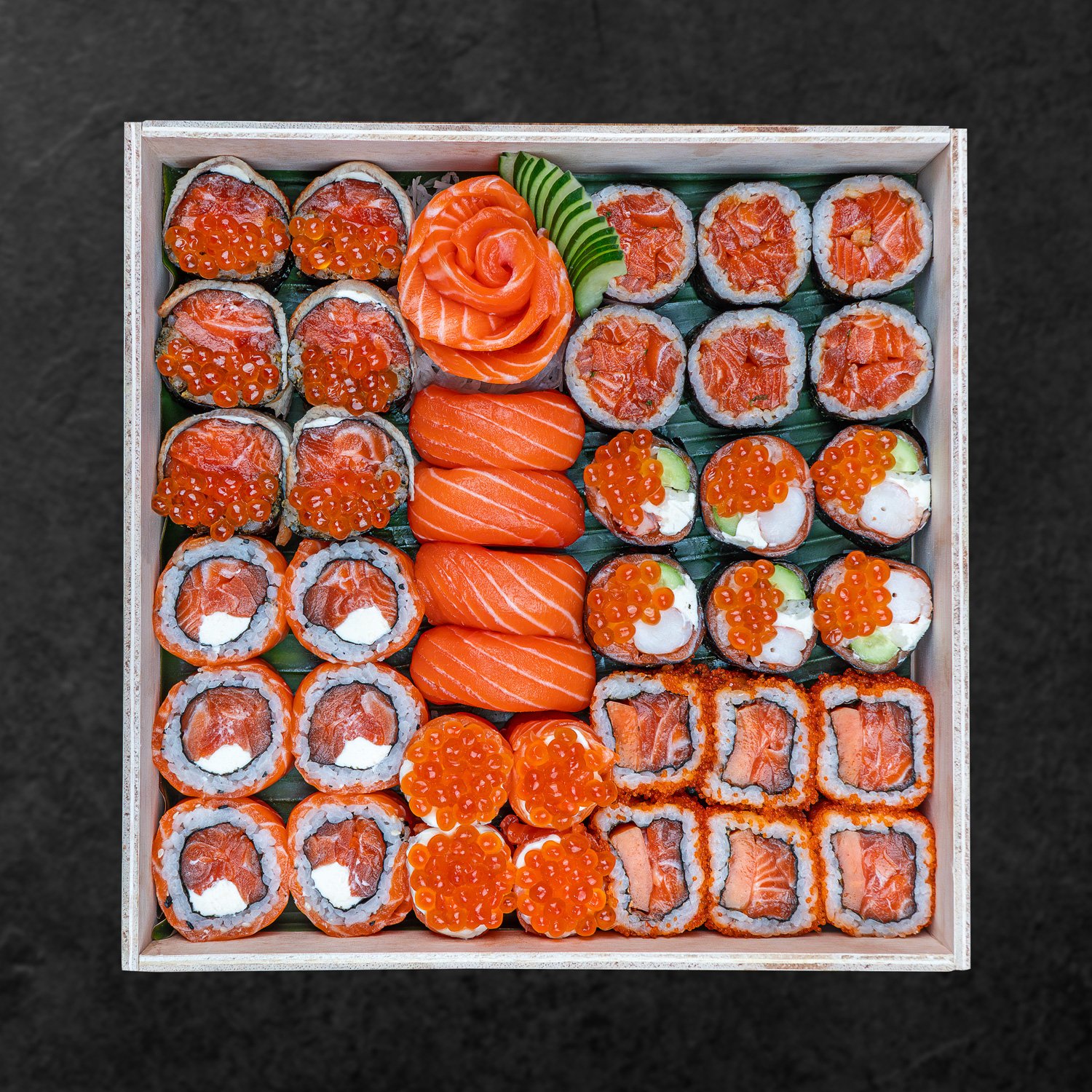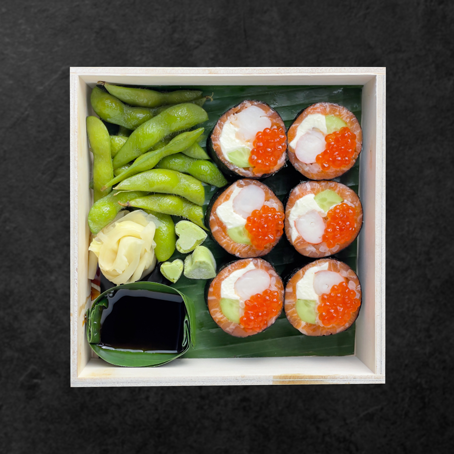 Philadelphia Roll 6pcs, Furikake Roll 6pcs, Tobiko Roll 6pcs, Salmon Maki 6pcs, Salmon Nigiri 4pcs, Salmon Sashimi 4pcs, Hana Sushi Caviar 2pcs, Hana Sushi Edamame 2pcs, (already include condiment truffle edamame, soy sauce, pickle ginger, wasabi)