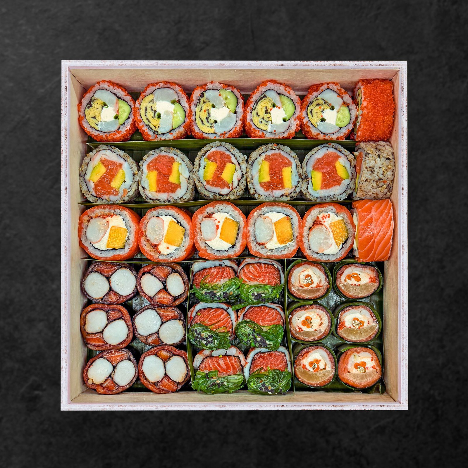 (4Pcs)Hana Sushi Caviar, (4Pcs)Hana Sushi Tobiko, (4Pcs)Hana Sushi Chuka, (4Pcs) Hana Sushi Edamame, (4Pcs) Nigiri Sushi Salmon, (already include condiment truffle edamame, soy sauce, pickle ginger, wasabi)